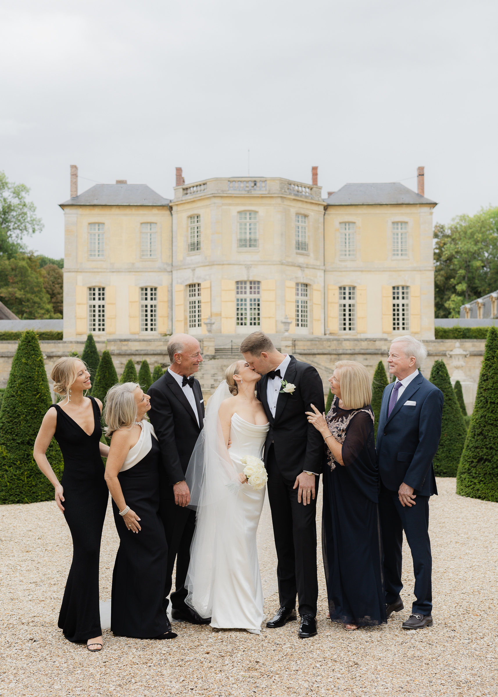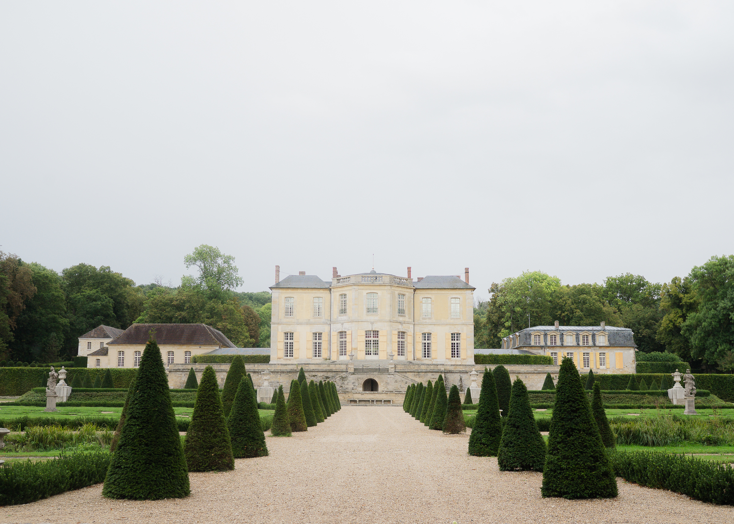As the ceremony began, soft rain fell over the château gardens and this only added to the magic!! It truly did. Afterwards, we returned to Paris for an intimate dinner for eight at Hôtel de Crillon, where luxury, candlelight, and evening portraits brought the day to a graceful and joyful close.